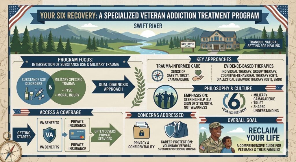 Veterans addiction treatment called Your Six Recovery at Swift River in Cummington, Massachusetts is a specialized form of healthcare that addresses substance use disorders alongside military-specific issues like PTSD, moral injury, and chronic pain. These programs use evidence-based therapies and trauma-informed care to help former service members recover in an environment that respects their unique background and culture.
