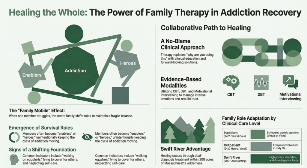 Family therapy in addiction treatment is a collaborative process where a therapist works with both the individual in recovery and their loved ones to repair relationships and improve communication. It focuses on the family as a system, identifying patterns that may unintentionally support substance use while building a healthier environment for long-term sobriety. At Swift River in Cummington, we treat the family as an essential part of the healing team.